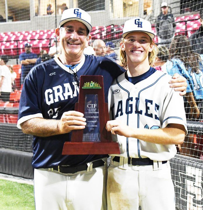 Granite Hills baseball coach James Davis and senior pitcher Luke Bailey showcase the team’s San Diego Section Open Division championship trophy. (Brents)