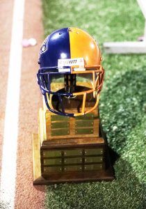 One half of the football helmet trophy, colored in dark blue, is labelled with the Steele Canyon logo while the other half, colored in orange, is emblazoned with the Valhalla logo.
