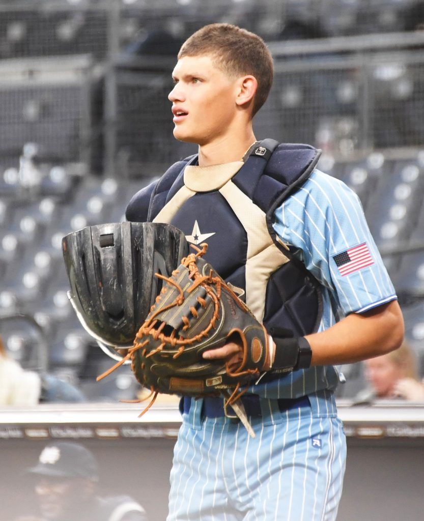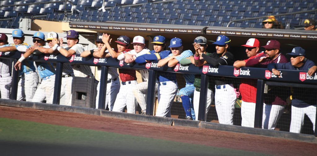 Give them a hand! East team members line the dugout rail during this year’s San Diego Padres High School Baseball All-Star Night at Petco Park on June 25.