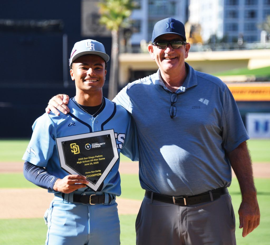 Granite Hills’ Brenden Lewis poses with home run derby award with Eagles head coach James Davis.