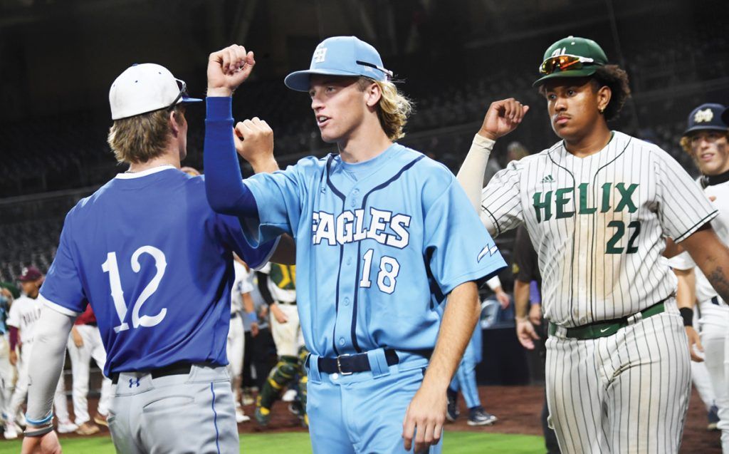 West Hills’ Joey Monetti threw out a runner attempting to steal.Granite Hills’ Luke Bailey and Helix’s Antoin Simpson exchange post-game handshakes with the runner-up West team.