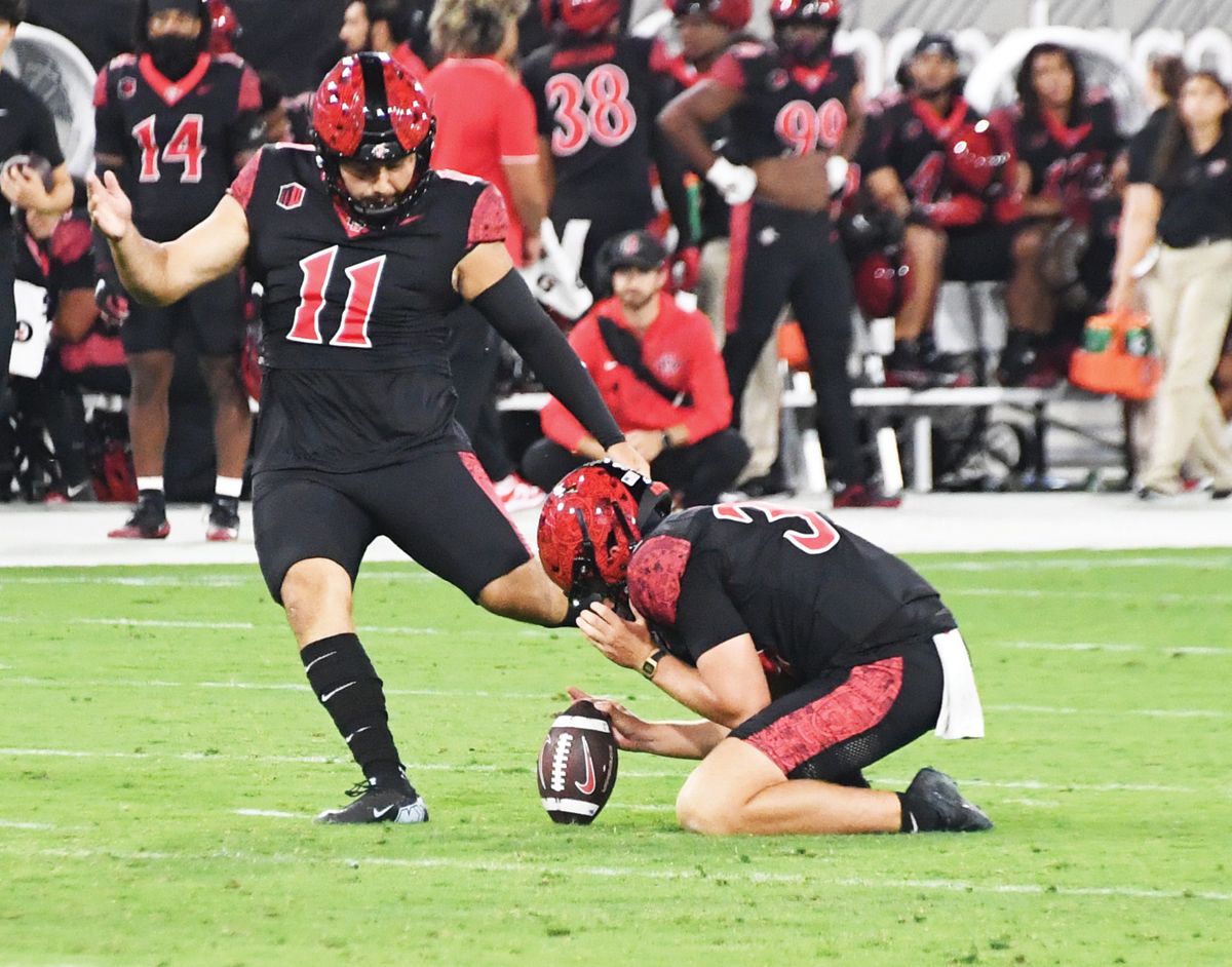 He split the uprights from 42 yards out with 12:20 remaining in the second quarter to extend SDSU’s lead to 10-0 and added a 50-yarder with 1:33 to play in the first half for a 13-0 Aztec lead. He converted a 27-yard field goal in the fourth quarter to put the visitors up 16-0.